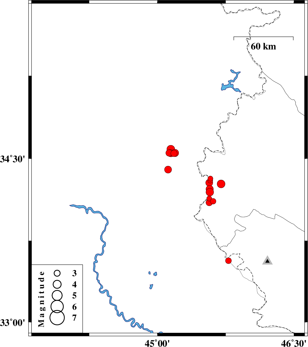 2019/01/23 09:45:20.3 13:15:20.3 34.22245.57414 ML3.7 Kermanshah Province, 33 km South of Qasr-E-Shirin