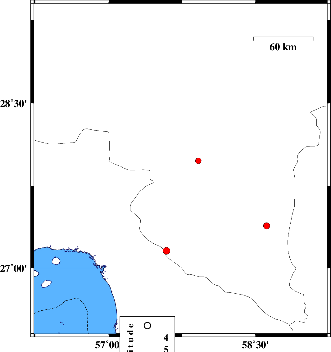 | 2019/01/28 | 15:08:18.8 | 18:38:18.8 | 28.487 | 57.037 | 14 | ML2.7 | Kerman Province, 71 km South-West of Jiroft |
