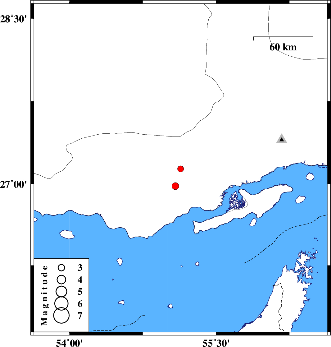 | 2019/02/23 | 20:03:49.5 | 23:33:49.5 | 26.978 | 55.083 | 7 | ML3.2 | Hormozgan Province, 55 km North-East of Bandar-e lengeh |