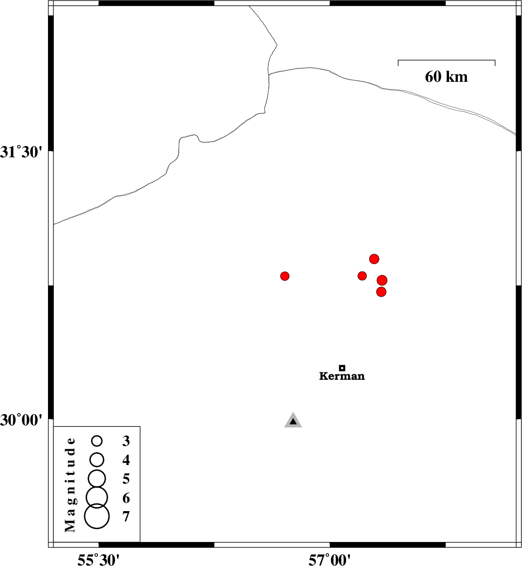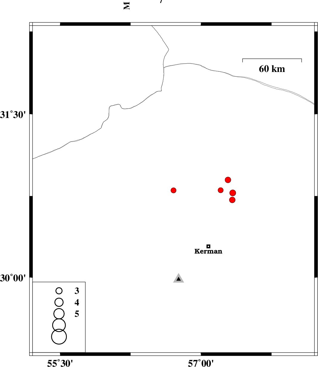 | 2019/02/22 | 15:18:50.4 | 18:48:50.4 | 30.779 | 57.338 | 14 | ML2.9 | Kerman Province, 60 km North-East of Kerman | ||