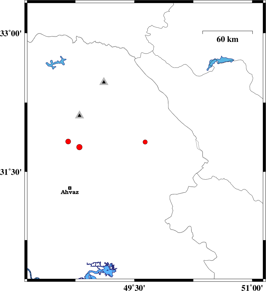 | 2019/02/23 | 01:00:11.5 | 04:30:11.5 | 31.829 | 48.657 | 15 | ML3 | Khoozestan Province, 30 km South-West of Shushtar |