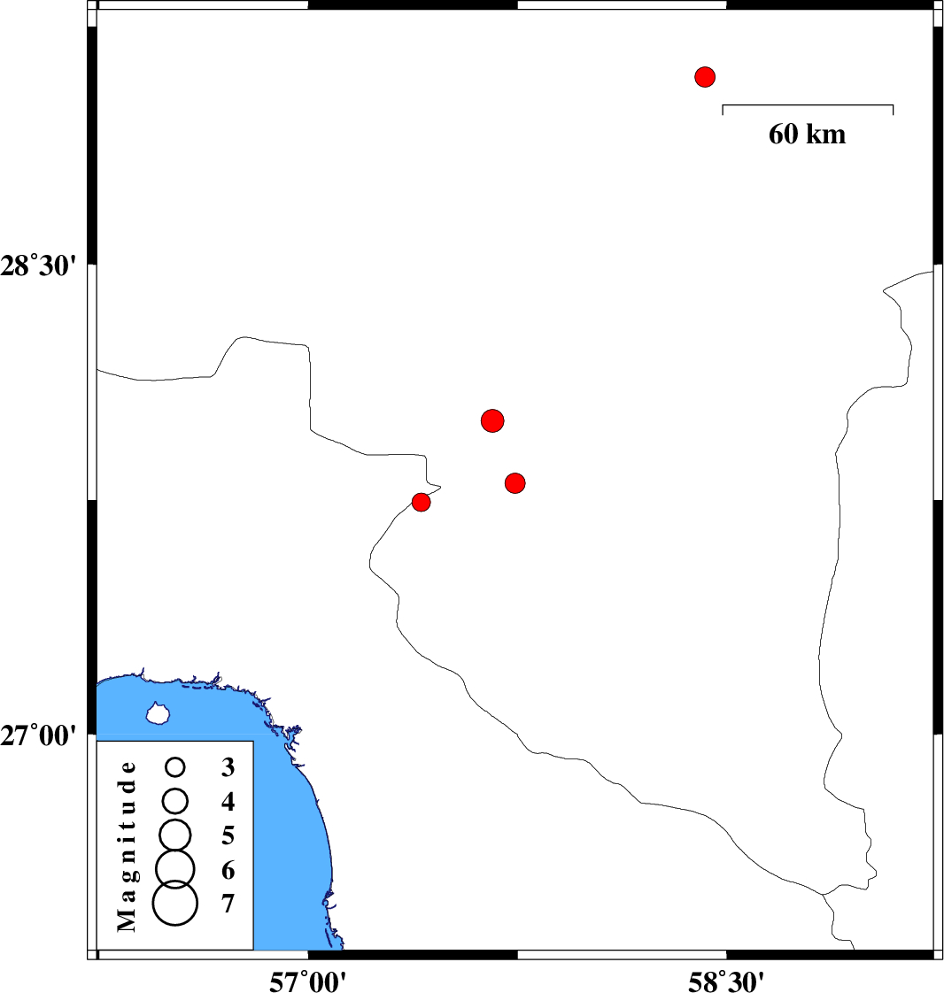 | 2019/02/25 | 23:26:50.6 | 02:56:50.6 | 27.804 | 57.741 | 14 | ML3.2 | Kerman Province, 17 km South of Kahnuj | ||