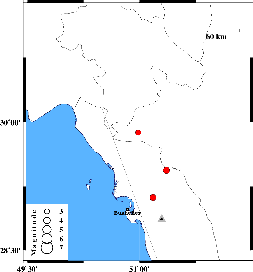 | 2019/04/19 | 00:57:45.5 | 05:27:45.5 | 29.12 | 51.18 | 5 | ML3.8 | Bushehr Province, 16 km South of Borazjan |