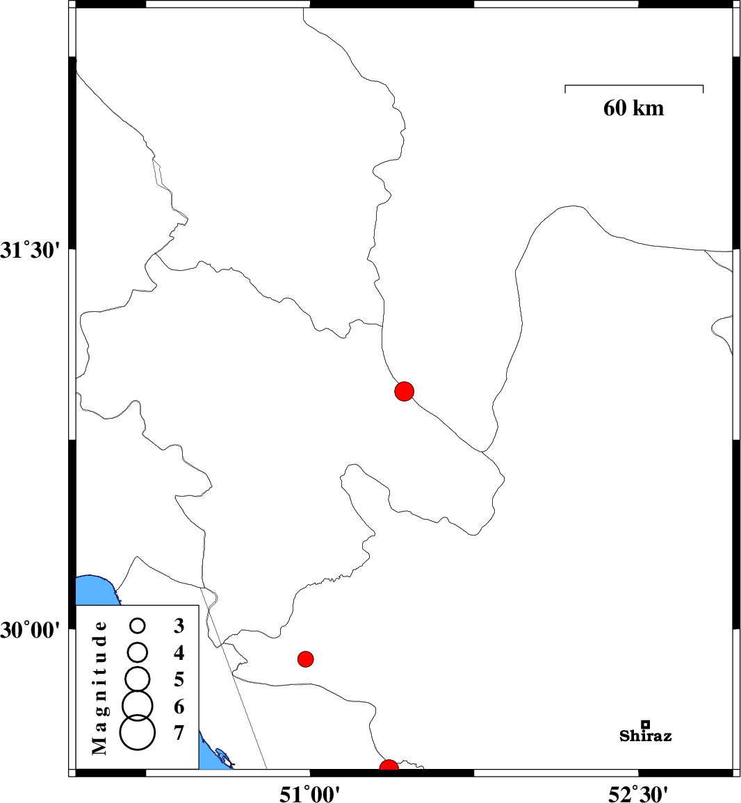 | 2019/04/24 | 04:39:15.3 | 09:09:15.3 | 30.94 | 51.43 | 5 | Mb4 | Kohkiluieh va boyerahmad Province, 9 km of Sisakht | ||