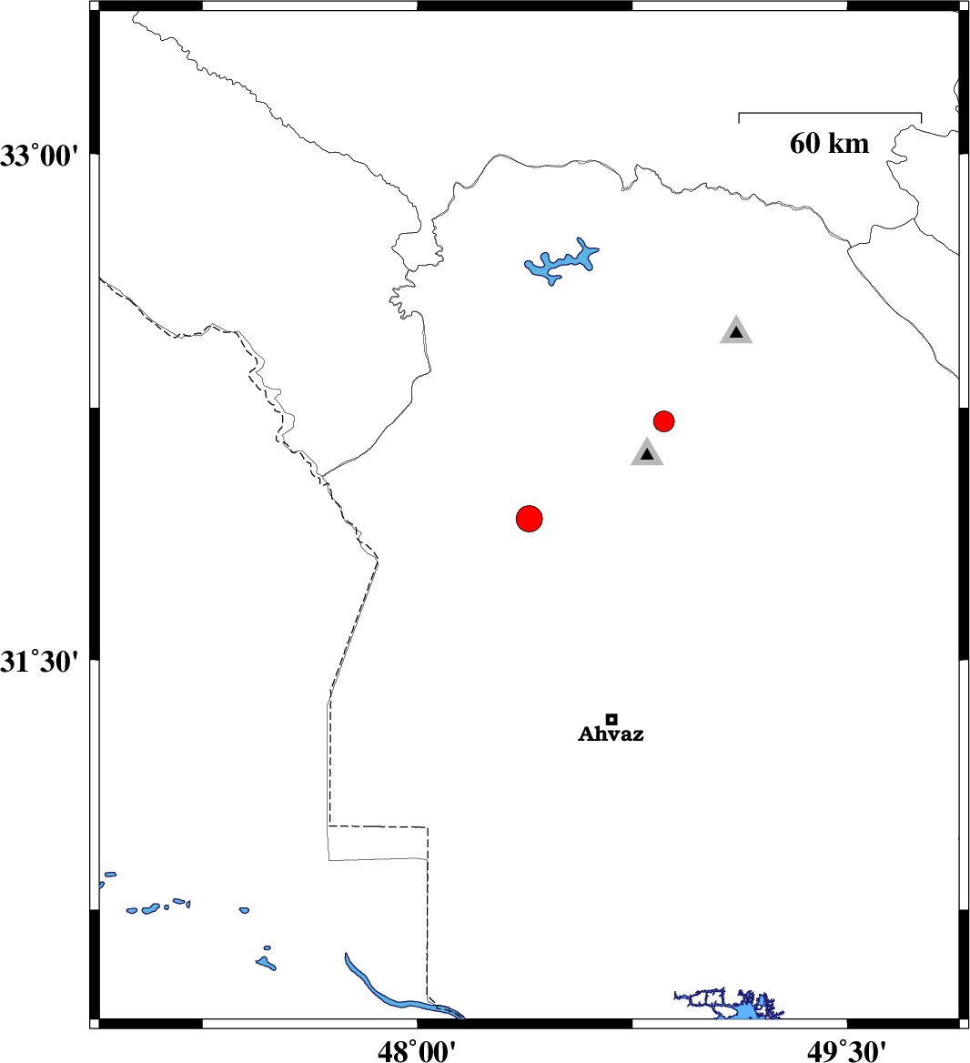 | 2019/04/26 | 04:30:19.2 | 09:00:19.2 | 32.21 | 48.86 | 7 | ML3.2 | Khoozestan Province, 19 km North of Shushtar |