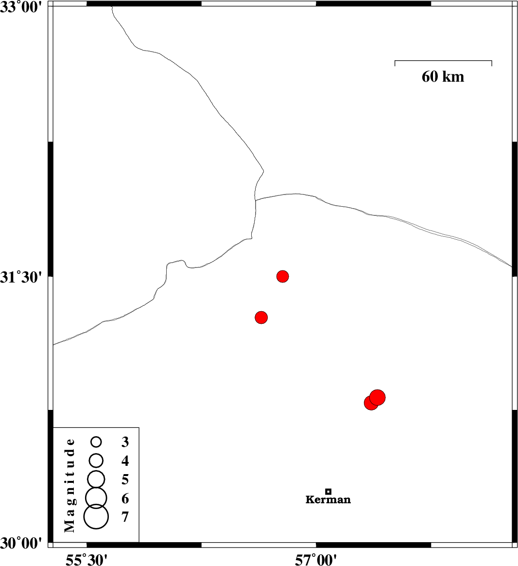 | 2019/04/16 | 22:43:48.4 | 03:13:48.4 | 30.79 | 57.36 | 10 | Mb4.3 | Kerman Province, 62 km North-East of Kerman |