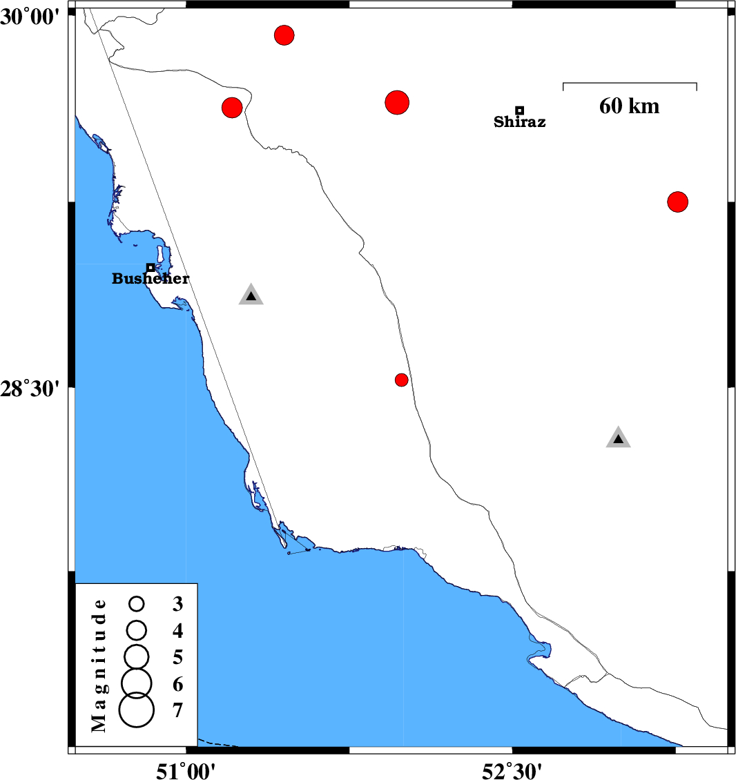 | 2019/05/19 | 04:19:54.0 | 08:49:54.0 | 29.63 | 51.21 | 10 | ML4.2 | Bushehr Province, 41 km North of Borazjan | ||
