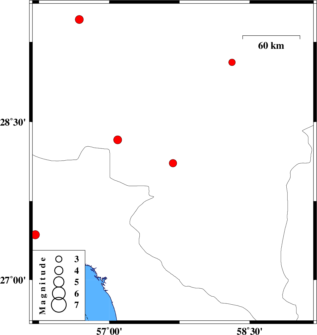 | 2019/05/19 | 08:13:25.9 | 12:43:25.9 | 28.11 | 57.68 | 7 | Mb3.6 | Kerman Province, 18 km North of Kahnuj | ||