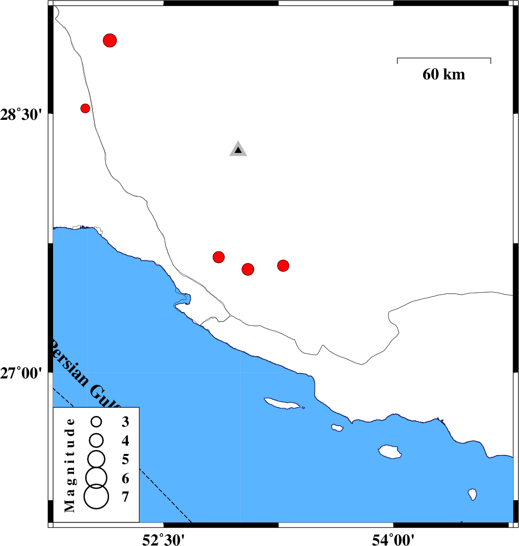 2019/05/19 | 01:29:36.9 | 05:59:36.9 | 28.53 | 51.99 | 5 | ML2.7 | Bushehr Province, 39 km South of Farashband |
