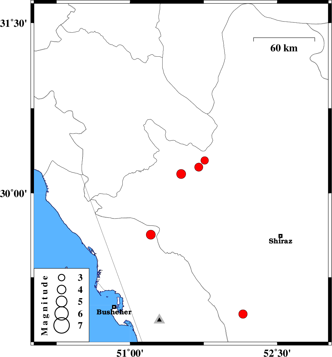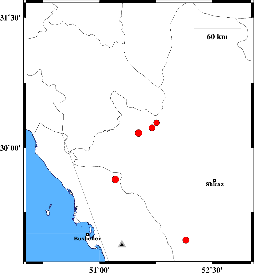 | 2019/05/19 | 04:19:54.0 | 08:49:54.0 | 29.63 | 51.21 | 10 | ML4.2 | Bushehr Province, 41 km North of Borazjan |