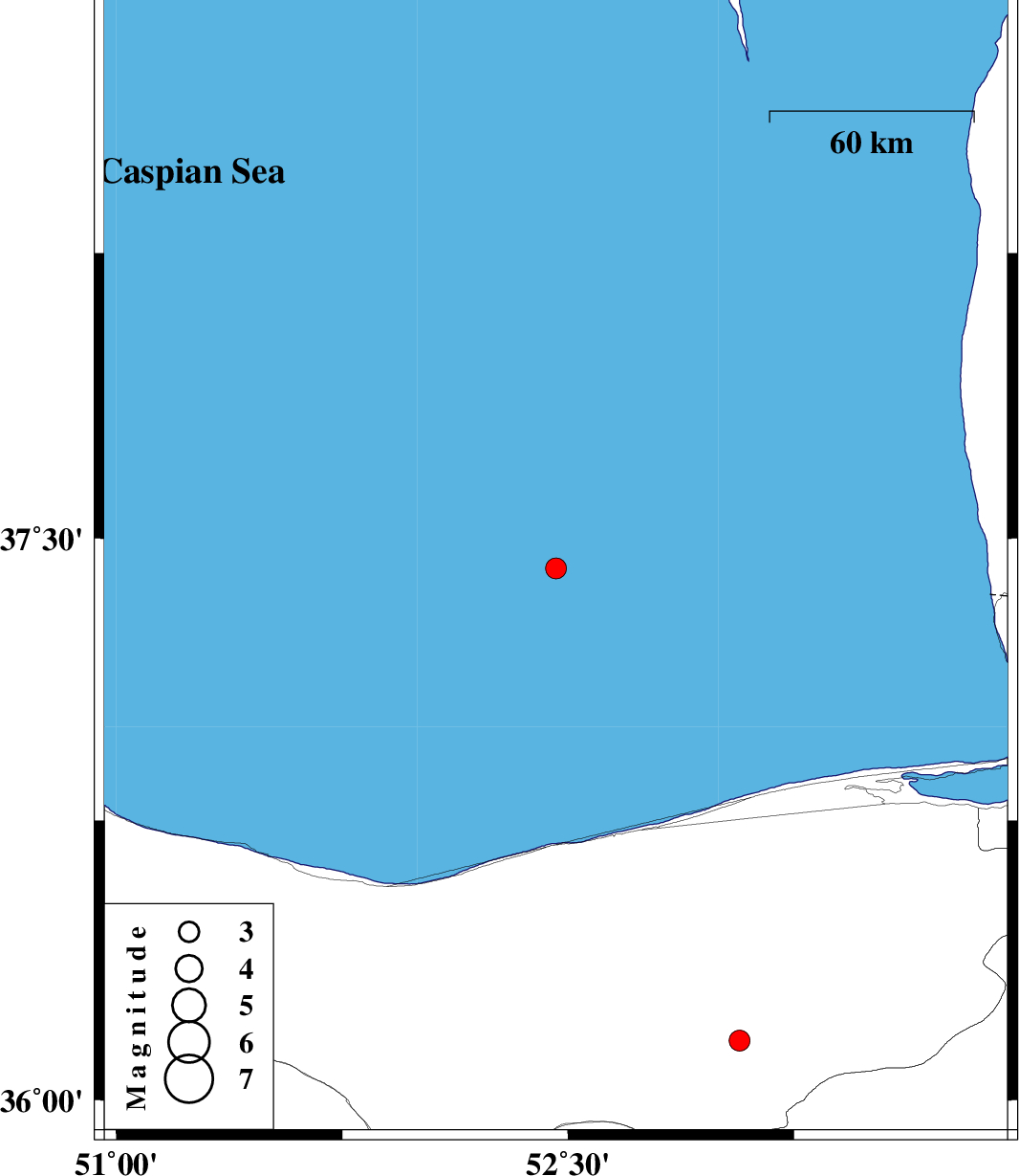 | 2019/06/20 | 21:54:37.7 | 02:24:37.7 | 37.42 | 52.46 | 12 | ML3.1 | Caspian Sea, 82 km North-West of Babolsar | ||