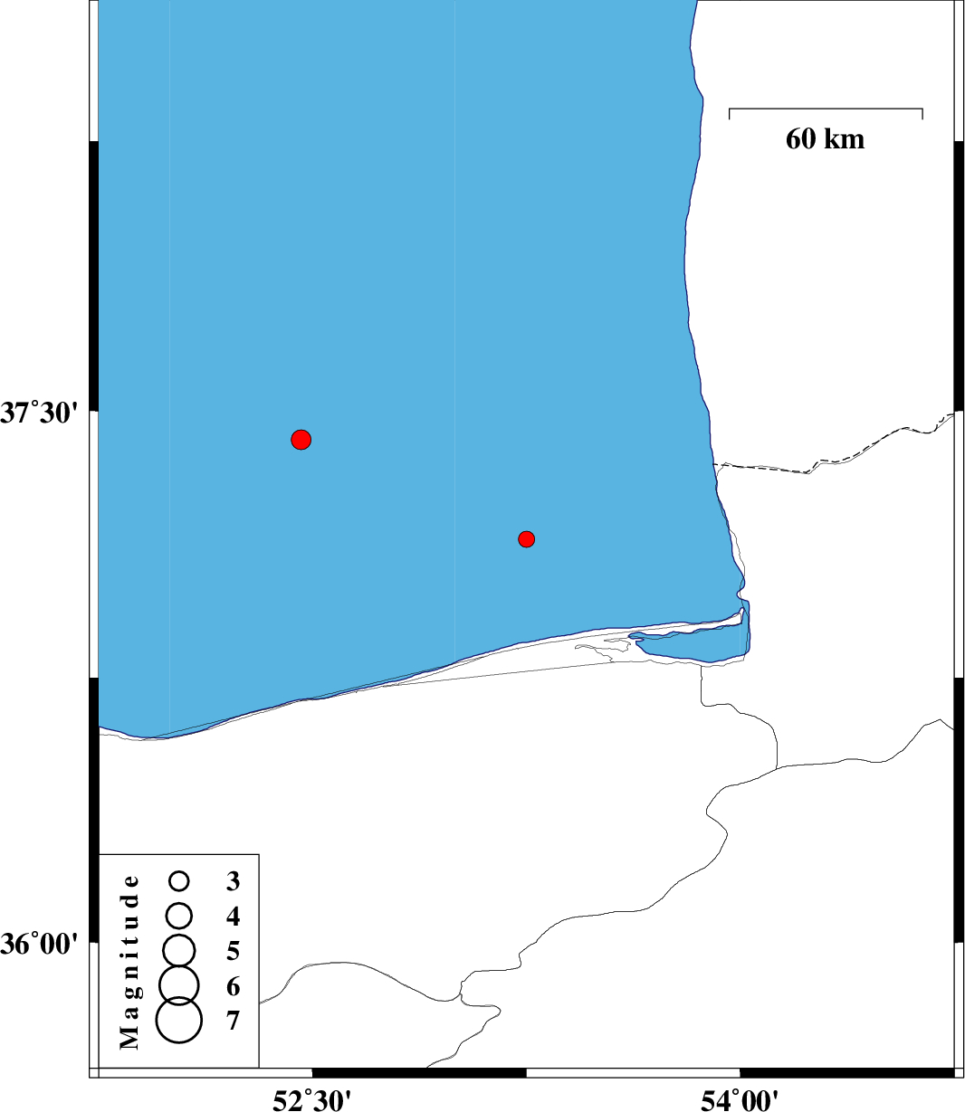 | 2019/06/20 | 21:54:37.7 | 02:24:37.7 | 37.42 | 52.46 | 12 | ML3.1 | Caspian Sea, 82 km North-West of Babolsar |