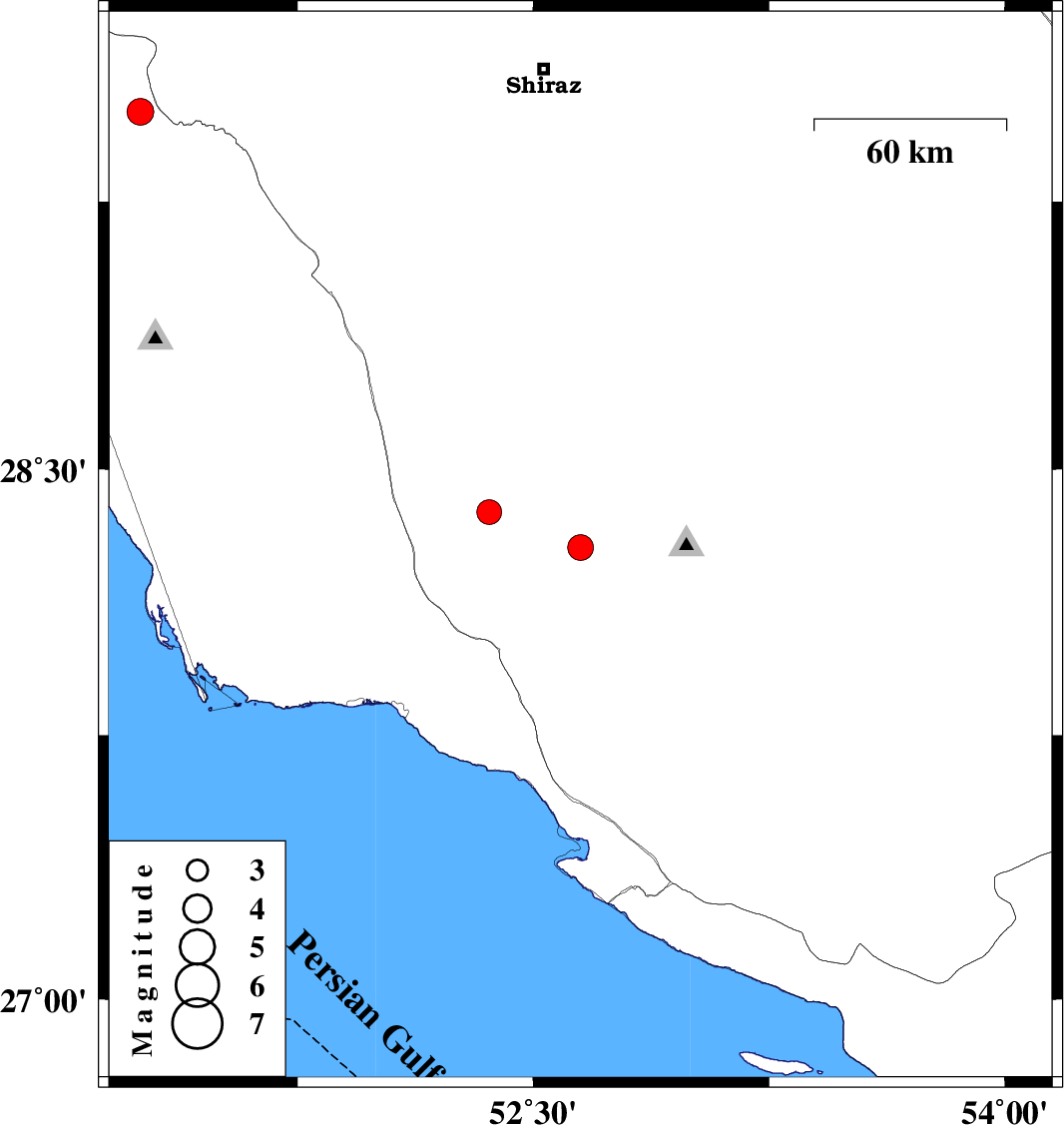| 2019/06/15 | 07:46:44.8 | 12:16:44.8 | 28.38 | 52.36 | 18 | ML3.5 | Fars Province, 61 km North of Jam |