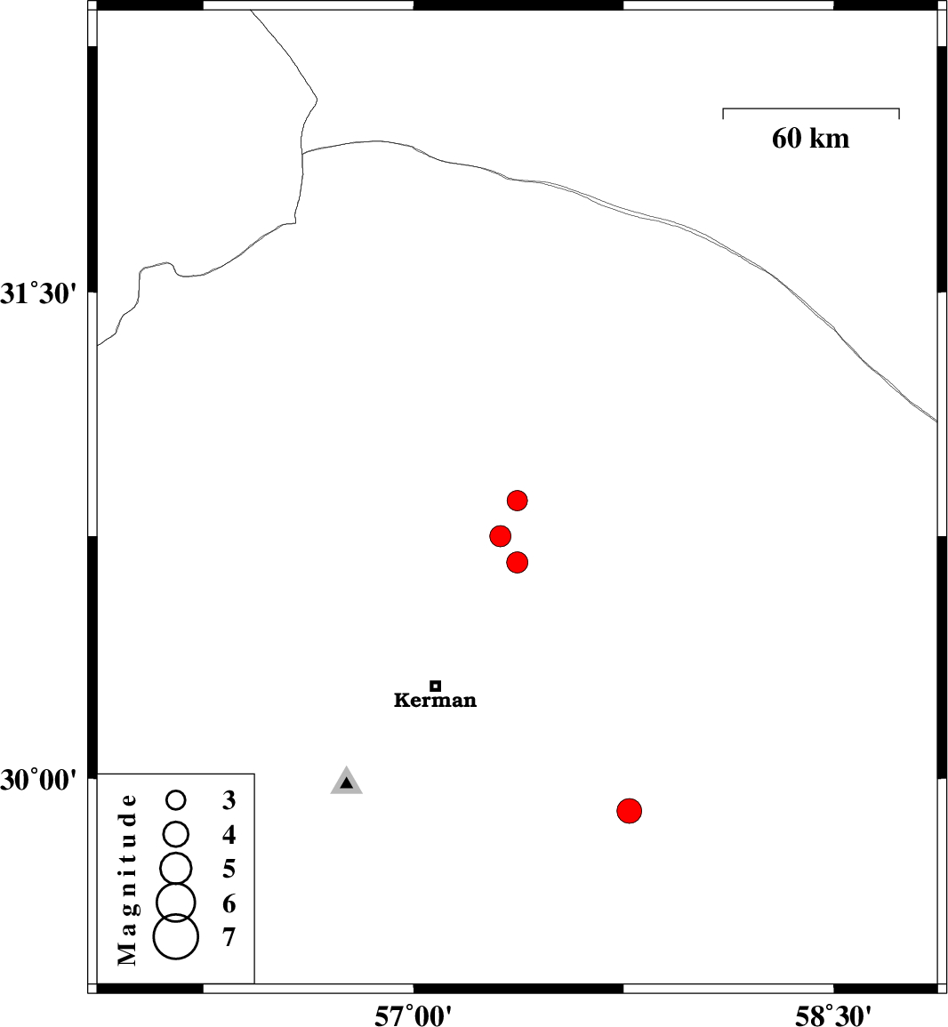 | 2019/06/24 | 21:02:00.7 | 01:32:00.7 | 29.9 | 57.77 | 9 | Mb3.9 | Kerman Province, 79 km South-East of Kerman |