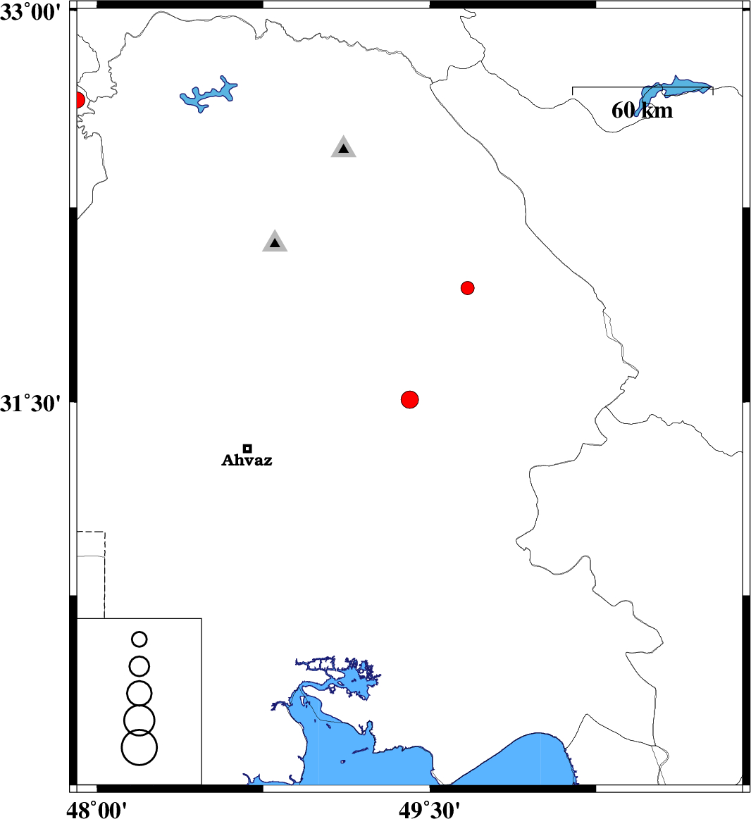 | 2019/07/28 | 19:11:16.1 | 23:41:16.1 | 31.51 | 49.41 | 14 | ML3.5 | Khoozestan Province, 32 km North-West of Ramhormoz | ||