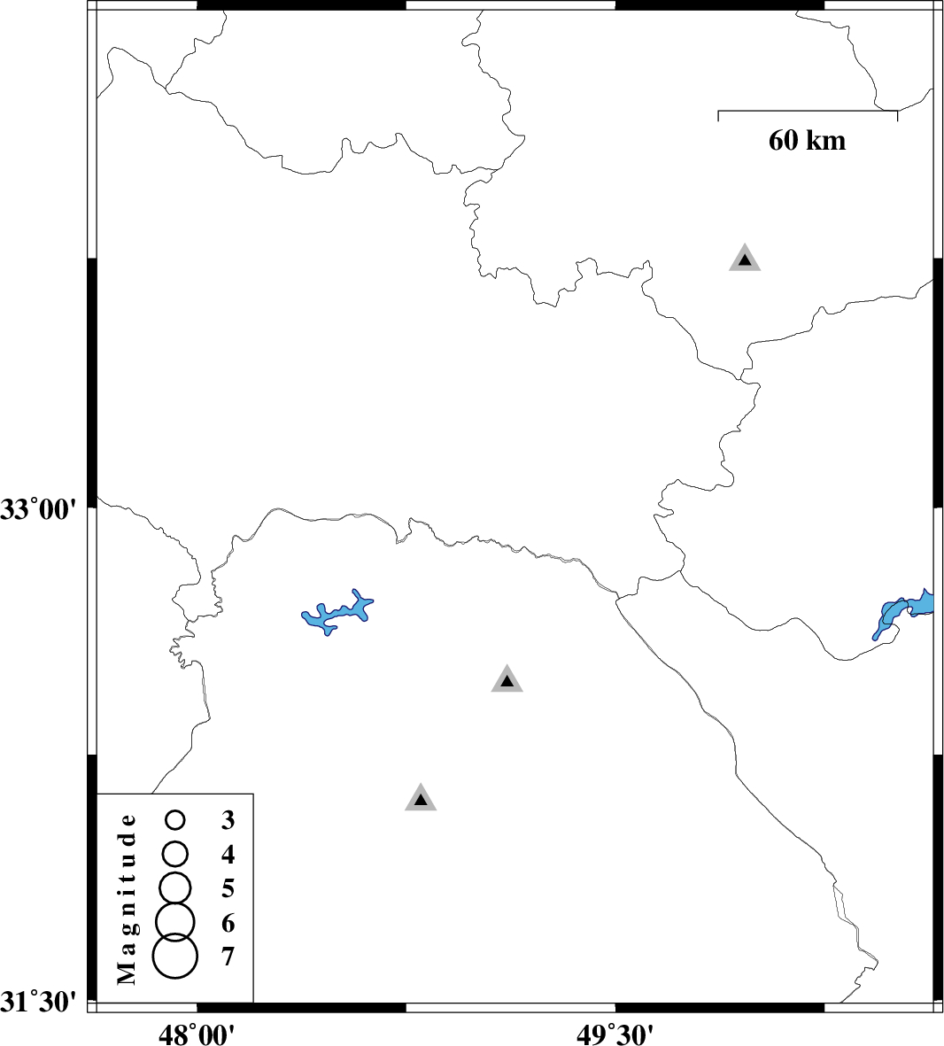 | 2019/08/13 | 01:26:11.5 | 05:56:11.5 | 32.99 | 49.14 | 19 | ML3.8 | Lorestan Province, 55 km South of Dorud |