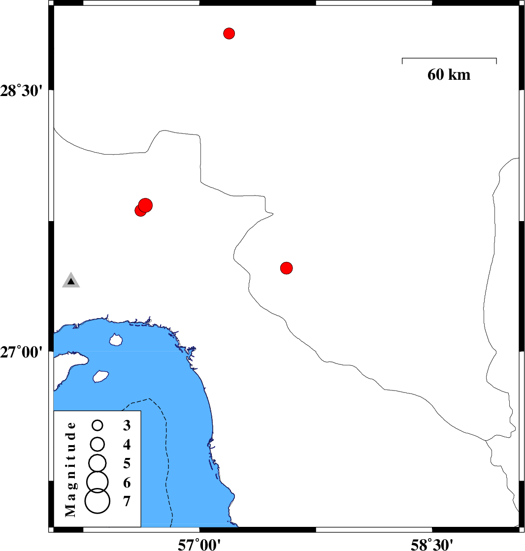 2019/08/28 | 16:36:15.5 | 21:06:15.5 | 27.48 | 57.56 | 14 | ML3.5 | Kerman Province, 10 km of Manujan | ||