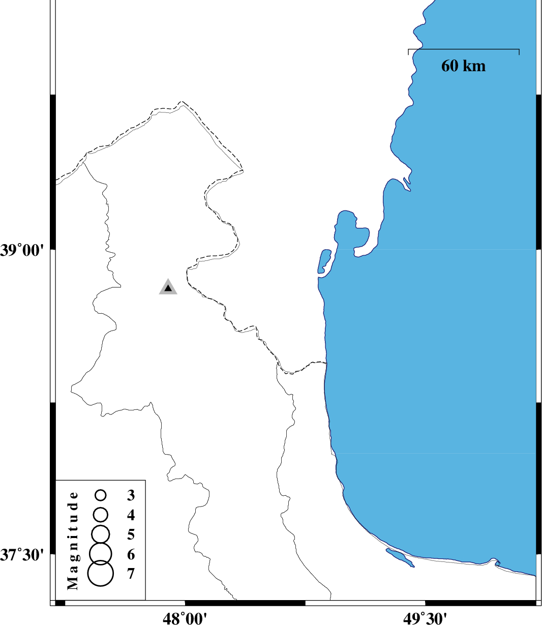 | 2019/09/09 | 02:45:00.0 | 07:15:00.0 | 38.77 | 48.69 | 6 | ML3.3 | Azerbaijan, 41 km North-West of Astara |