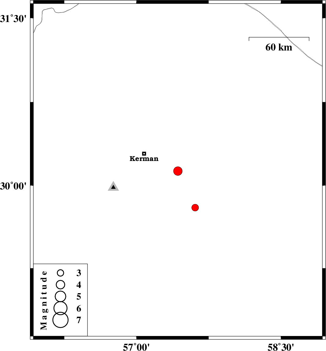 | 2019/09/11 | 17:02:29.3 | 21:32:29.3 | 30.13 | 57.43 | 25 | ML4.1 | Kerman Province, 38 km South-East of Kerman | ||