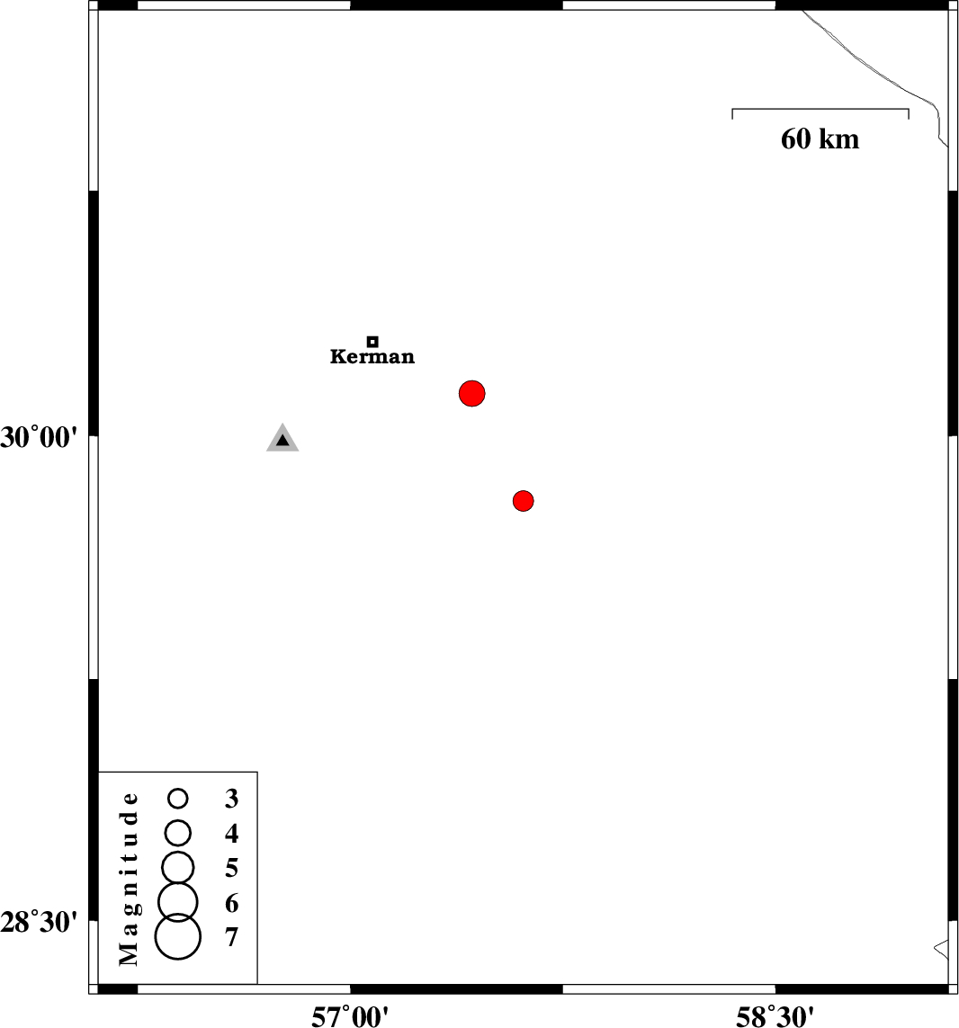 | 2019/09/11 | 17:02:29.3 | 21:32:29.3 | 30.13 | 57.43 | 25 | ML4.1 | Kerman Province, 38 km South-East of Kerman | ||