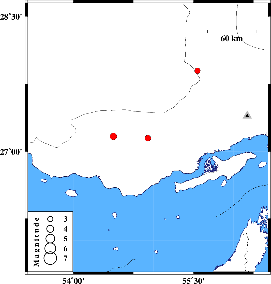 | 2019/09/26 | 15:49:30.7 | 19:19:30.7 | 27.15 | 54.93 | 14 | ML3.4 | Hormozgan Province, 56 km -East of Bastak | ||
