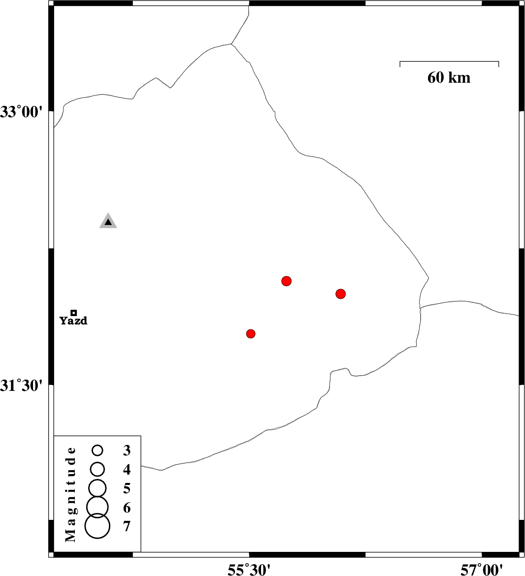 | 2019/08/30 | 20:42:14.1 | 01:12:14.1 | 32 | 56.09 | 14 | ML2.8 | Yazd Province, 79 km North-East of Bafq |