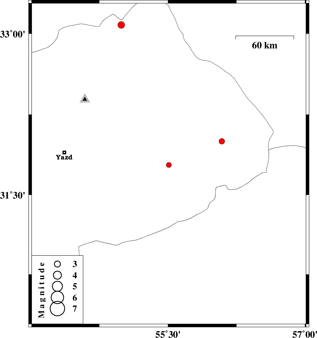 | 2019/09/03 | 10:44:12.1 | 15:14:12.1 | 31.78 | 55.51 | 5 | ML2.6 | Yazd Province, 22 km North-East of Bafq | ||