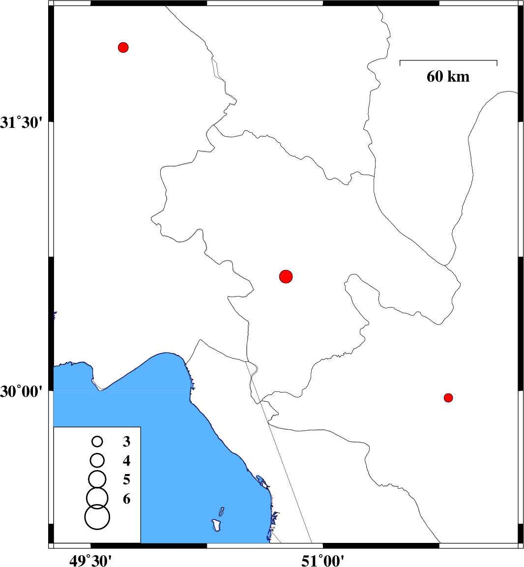 | 2019/10/02 | 08:35:12.9 | 12:05:12.9 | 29.96 | 51.81 | 5 | ML2.6 | Fars Province, 33 km South-East of Nurabad | ||