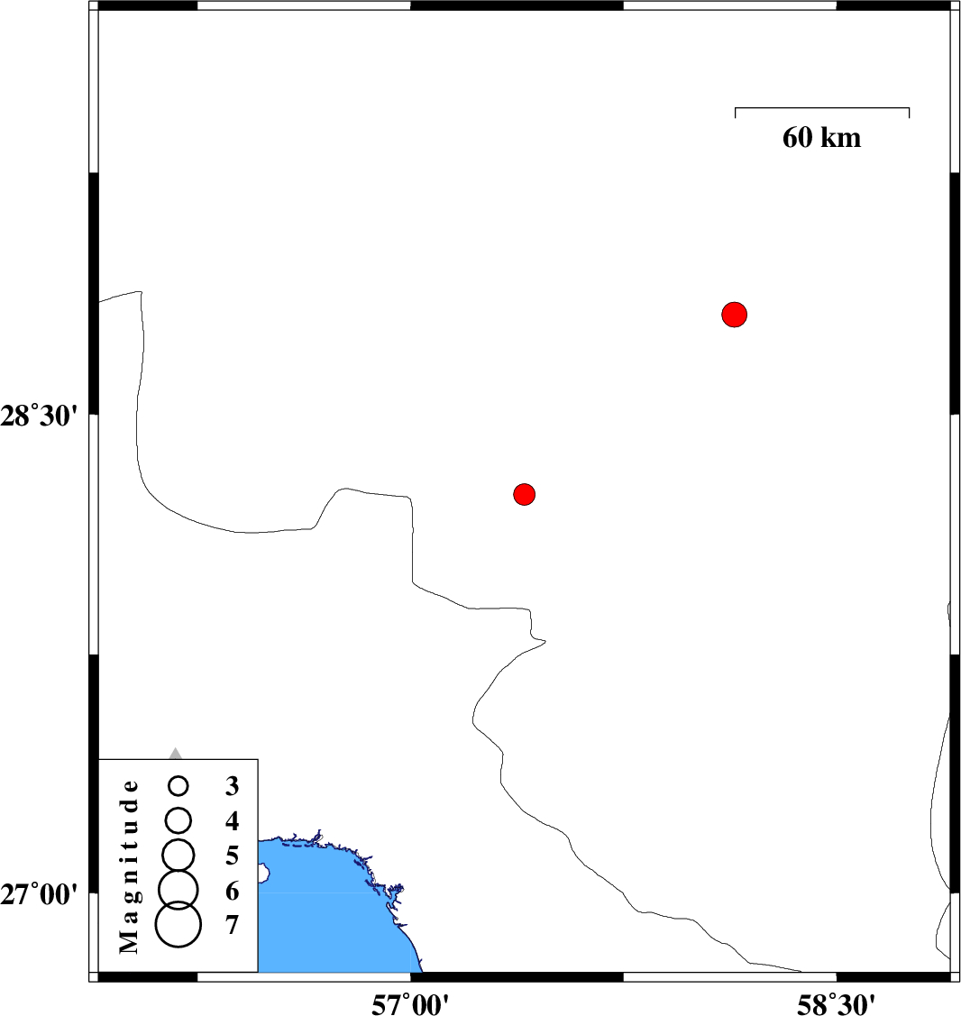 | 2019/09/28 | 23:53:16.2 | 03:23:16.2 | 28.81 | 58.14 | 14 | ML3.9 | Kerman Province, 39 km South-West of Bam |
