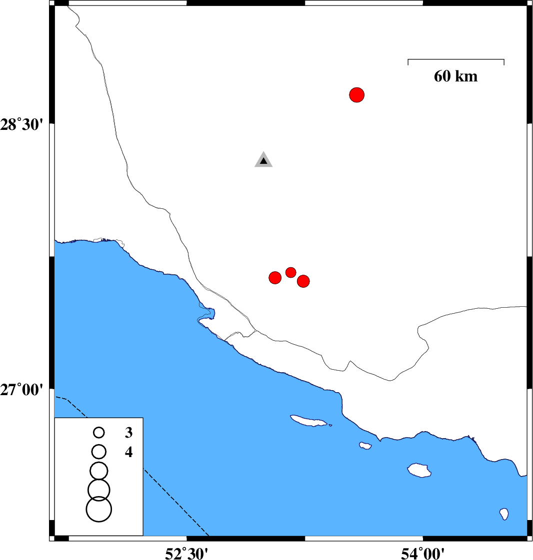 | 2019/10/06 | 00:17:52.8 | 03:47:52.8 | 27.66 | 53.16 | 16 | ML2.9 | Fars Province, 36 km North of Lamerd | ||