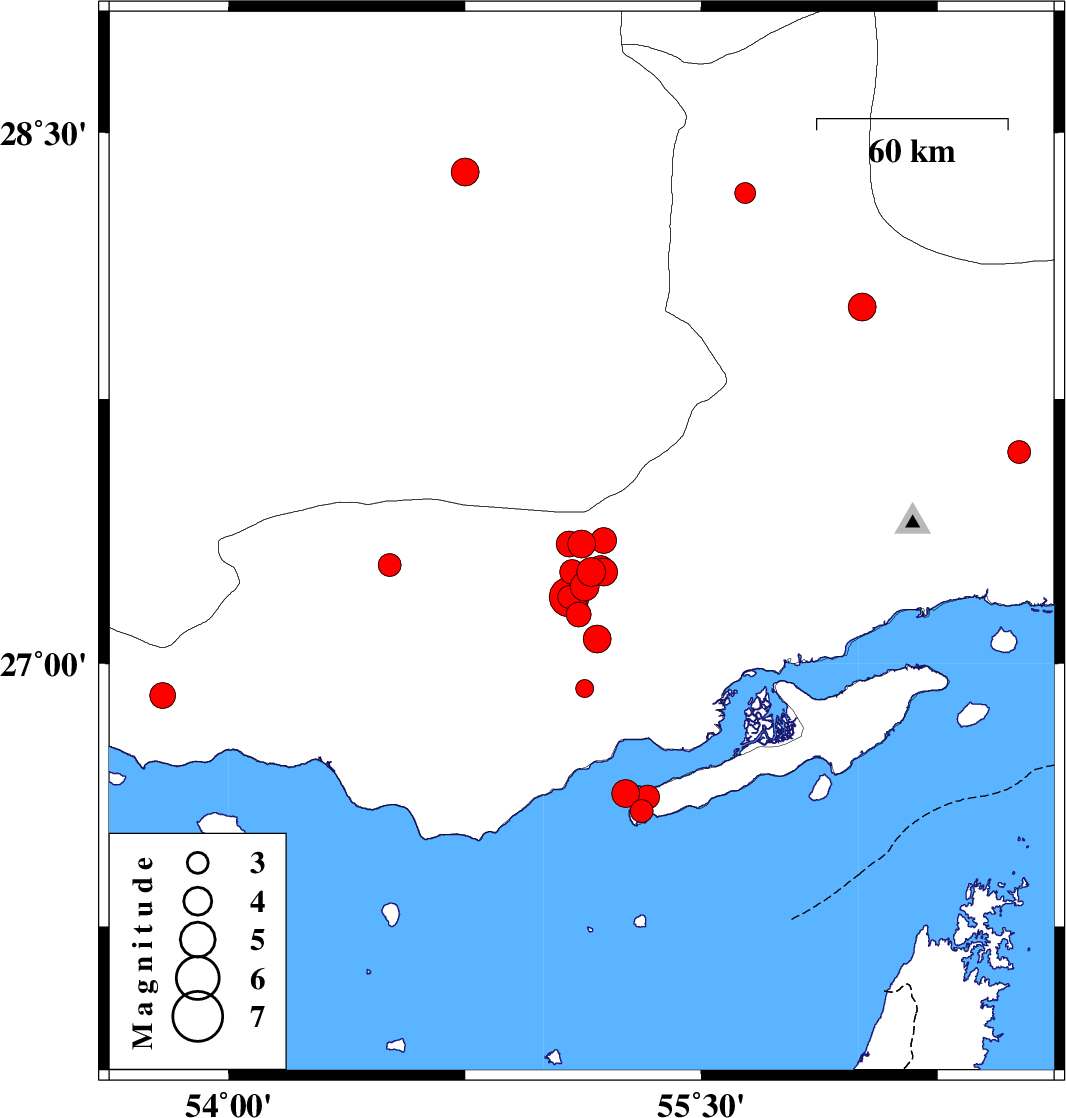 2019/10/30 11:33:06.9 15:03:06.9 27.3455.1214 ML4 Hormozgan Province, 76 km North-East of Bastak