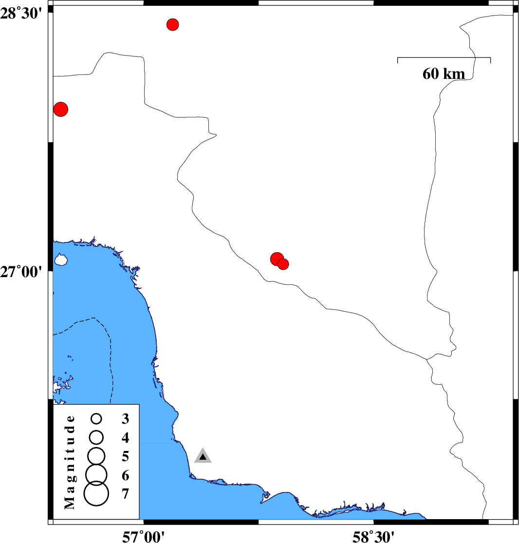 2019/11/11 00:12:29.8 03:42:29.8 27.0757.8714 ML4 Kerman Province, 53 km South-East of Manujan