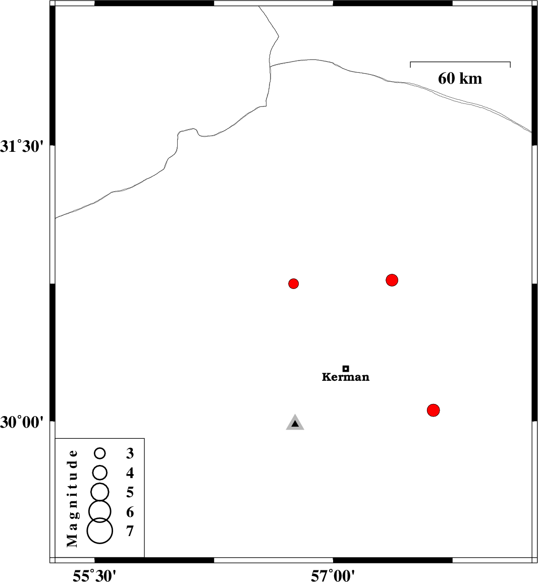 | 2019/10/22 | 18:04:29.1 | 21:34:29.1 | 30.77 | 57.37 | 14 | ML3.4 | Kerman Province, 60 km North-East of Kerman |