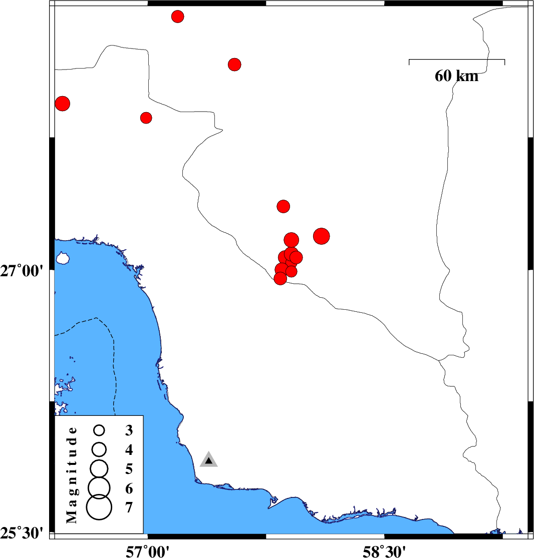 2019/11/11 00:12:29.8 03:42:29.8 27.0757.8714 ML4 Kerman Province, 53 km South-East of Manujan