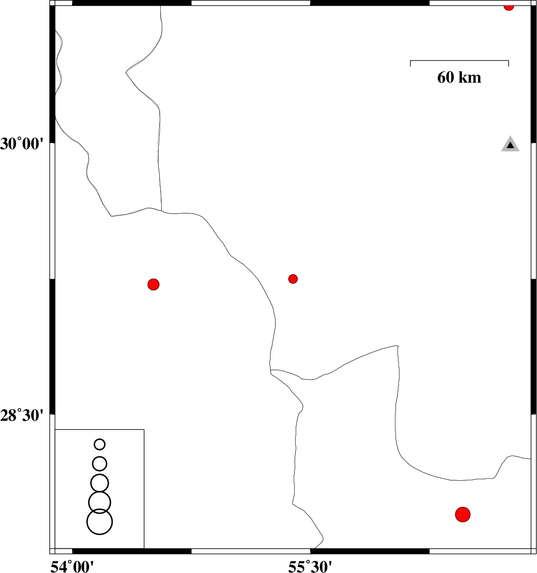 | 2019/11/05 | 01:17:55.8 | 04:47:55.8 | 28.14 | 54.34 | 14 | ML2.9 | Fars Province, 51 km North of Lar |