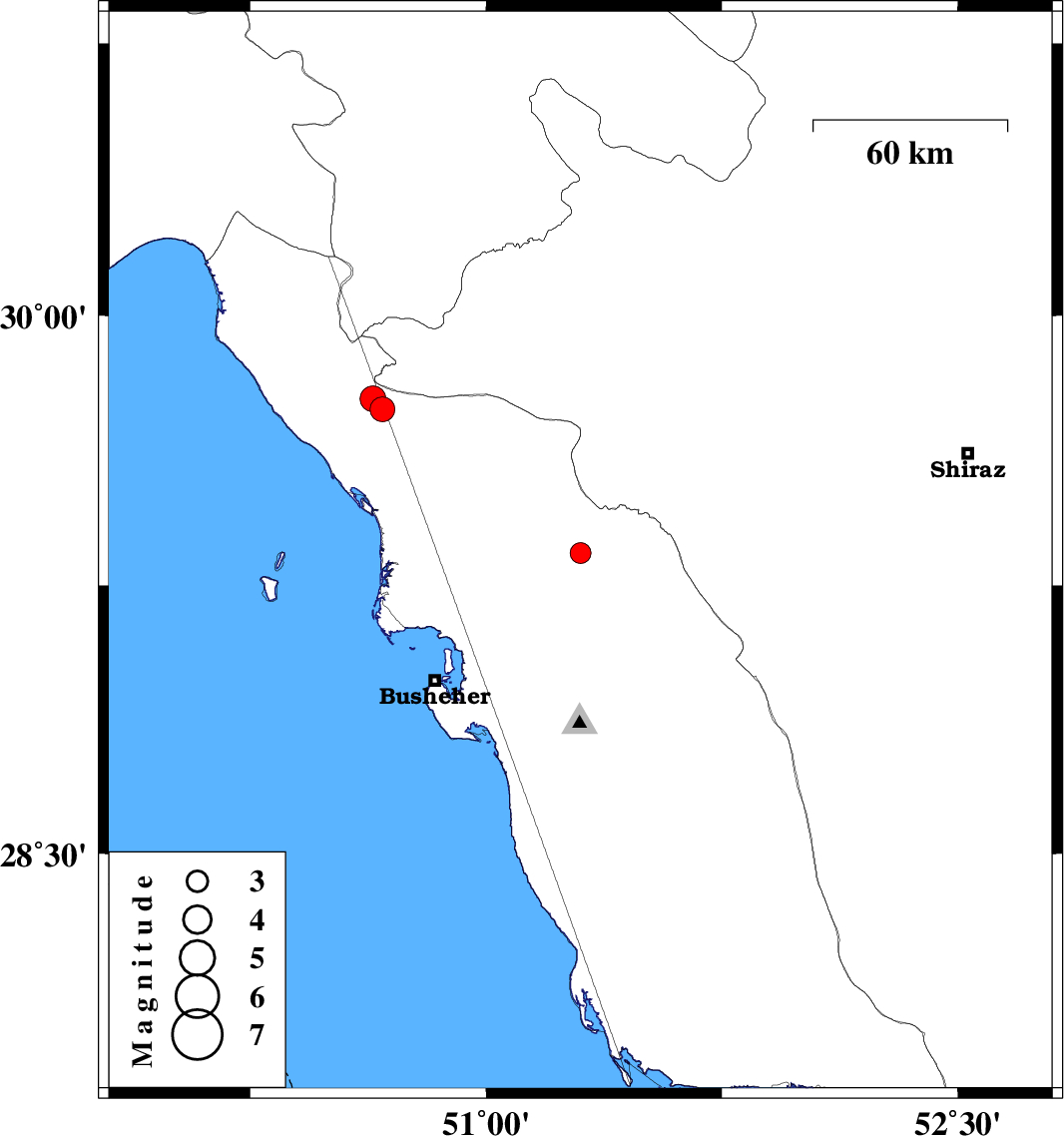 | 2019/11/25 | 12:30:52.1 | 16:00:52.1 | 29.77 | 50.64 | 14 | ML3.6 | Bushehr Province, 25 km North-East of Bandar-e genaveh |