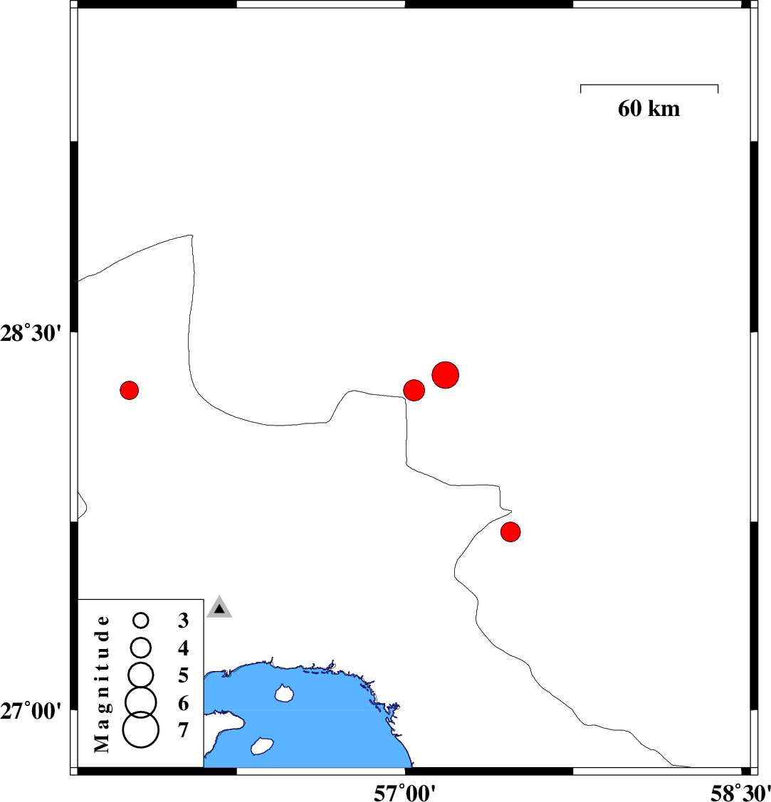 | 2020/03/27 | 06:40:44.6 | 11:10:44.6 | 28.33 | 57.18 | 15 | ML5.3 | Kerman Province, 66 km North-West of Kahnuj |