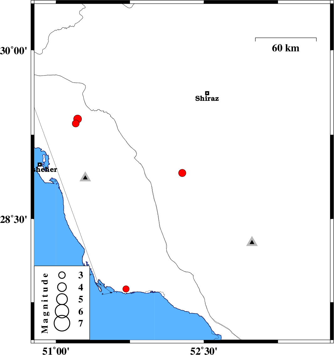| 2020/03/27 | 15:48:52.6 | 20:18:52.6 | 29.39 | 51.22 | 10 | ML3.6 | Bushehr Province, 14 km North of Borazjan |