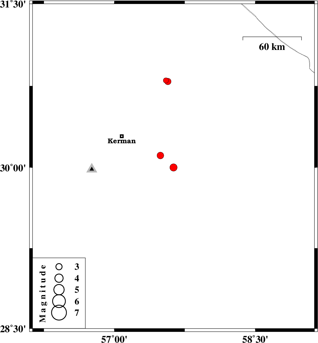 | 2020/05/19 | 05:59:11.0 | 10:29:11.0 | 30 | 57.63 | 10 | ML3.5 | Kerman Province, 62 km South-East of Kerman | ||