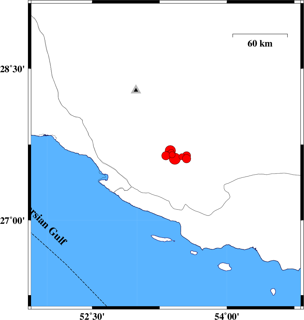 2020/06/09 19:44:54.5 00:14:54.5 27.6153.5510 ML4.2 Fars Province, 49 km North-East of Lamerd