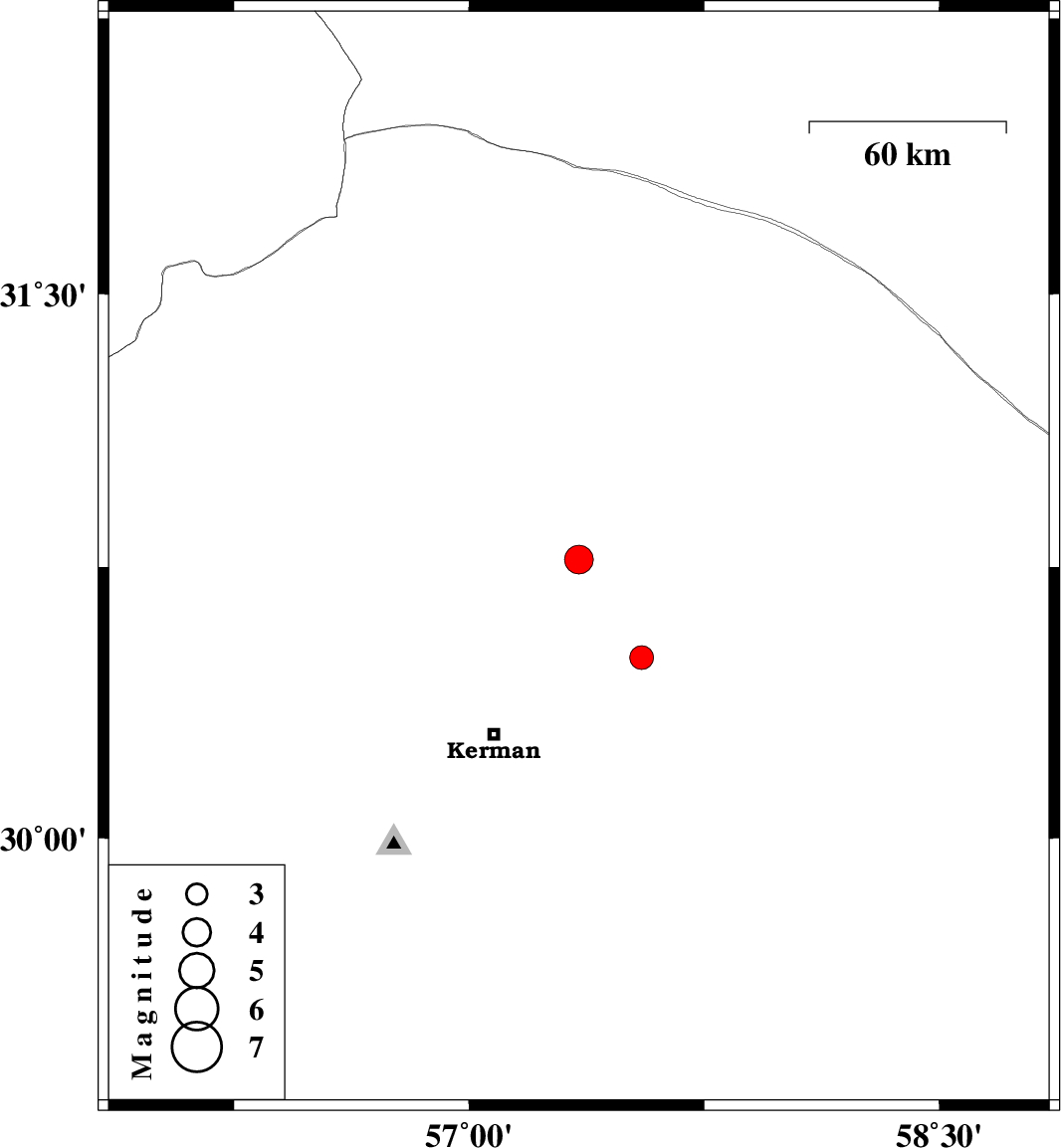 | 2020/06/27 | 07:48:03.3 | 12:18:03.3 | 30.77 | 57.35 | 10 | ML4.1 | Kerman Province, 60 km North-East of Kerman |