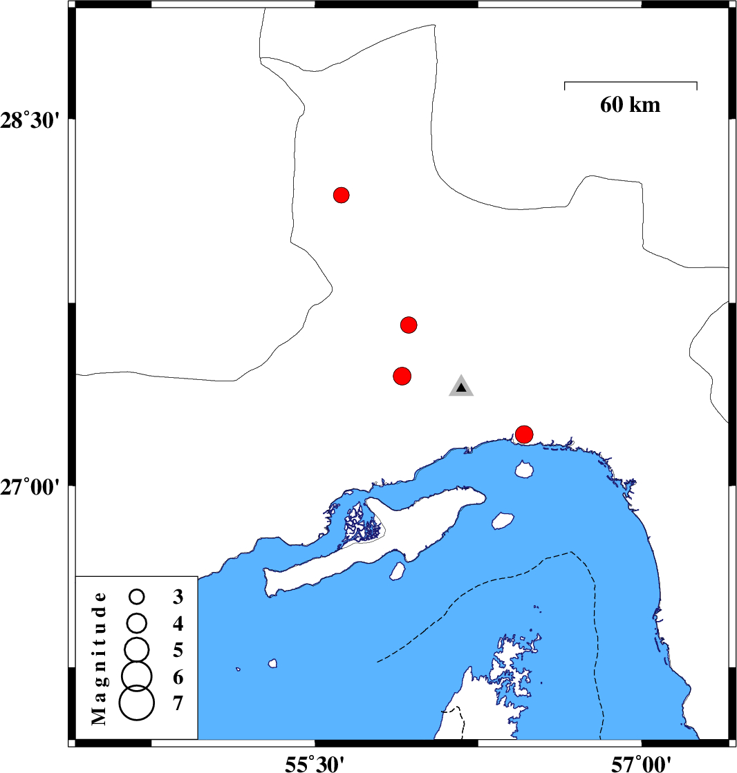 | 2020/06/21 | 00:12:37.6 | 04:42:37.6 | 27.66 | 55.93 | 20 | ML3.4 | Hormozgan Province, 72 km South of Hajiabad |