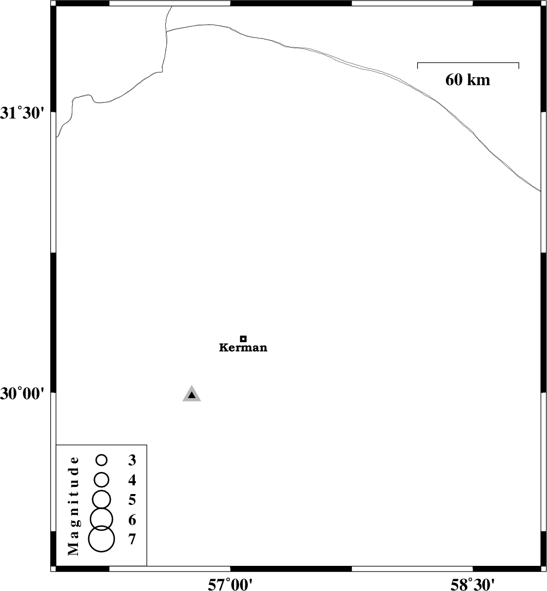 | 2020/07/17 | 10:57:33.9 | 15:27:33.9 | 30.56 | 57.42 | 10 | ML3.6 | Kerman Province, 45 km North-East of Kerman |
