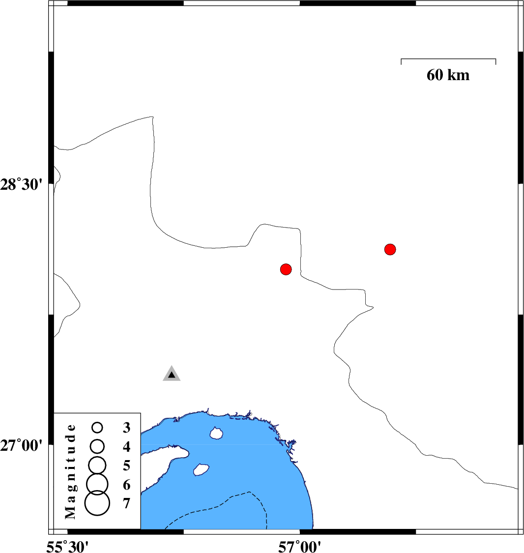 | 2020/07/13 | 01:20:36.6 | 05:50:36.6 | 28.124 | 57.584 | 12 | ML3.3 | Kerman Province, 22 km North-West of Kahnuj |