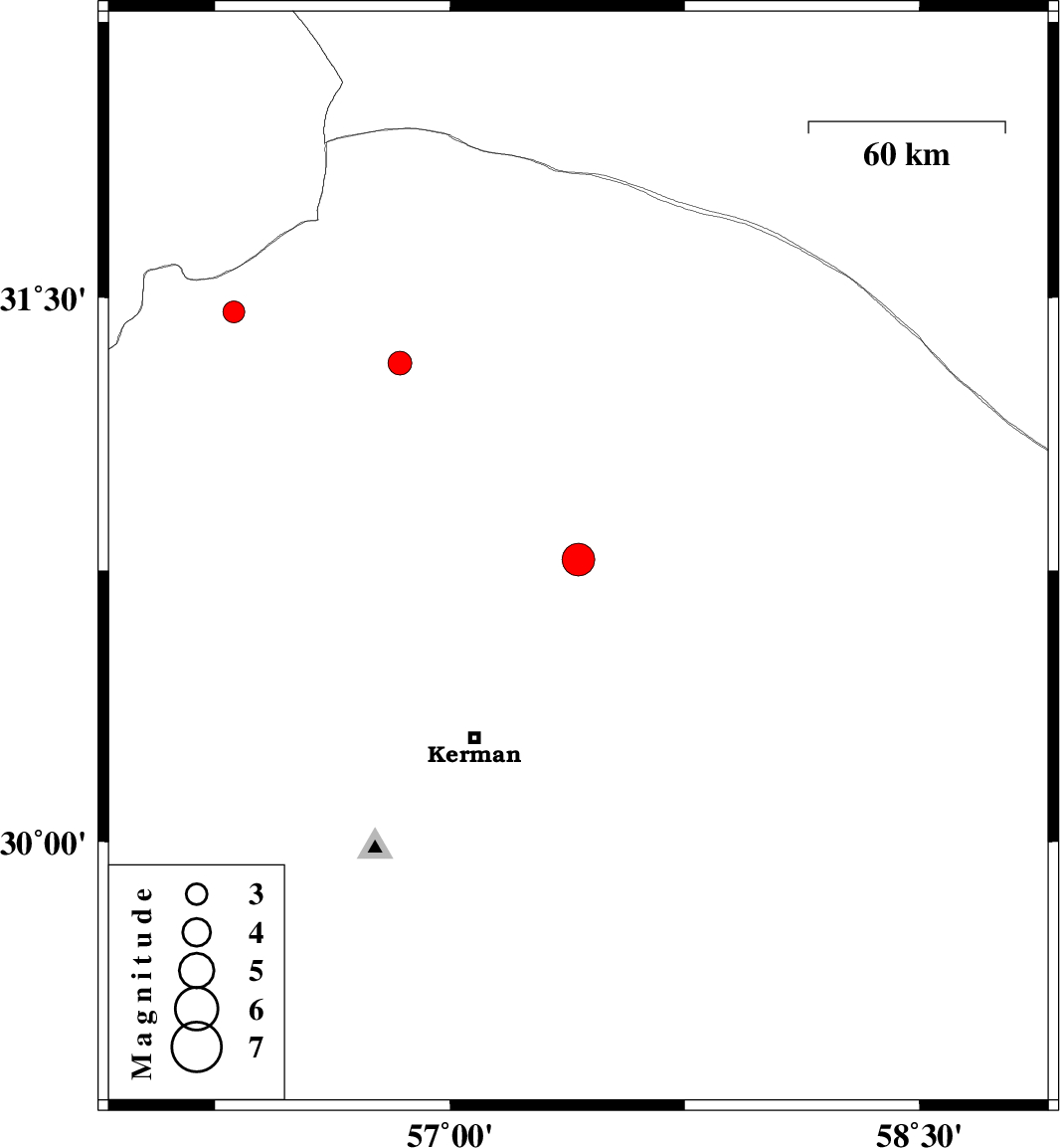 | 2020/07/28 | 06:06:39.9 | 10:36:39.9 | 30.78 | 57.41 | 10 | ML4.6 | Kerman Province, 63 km North-East of Kerman | ||