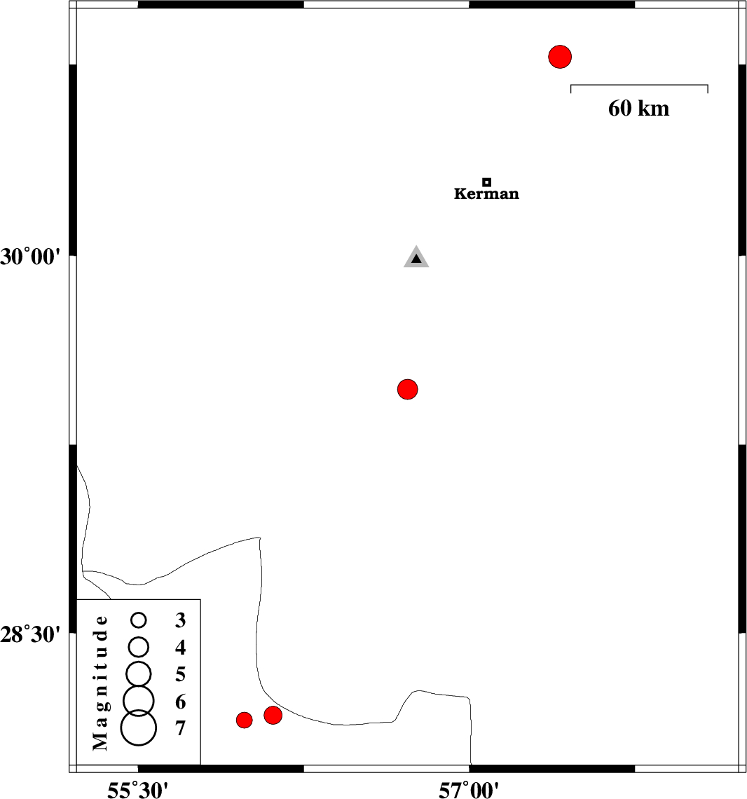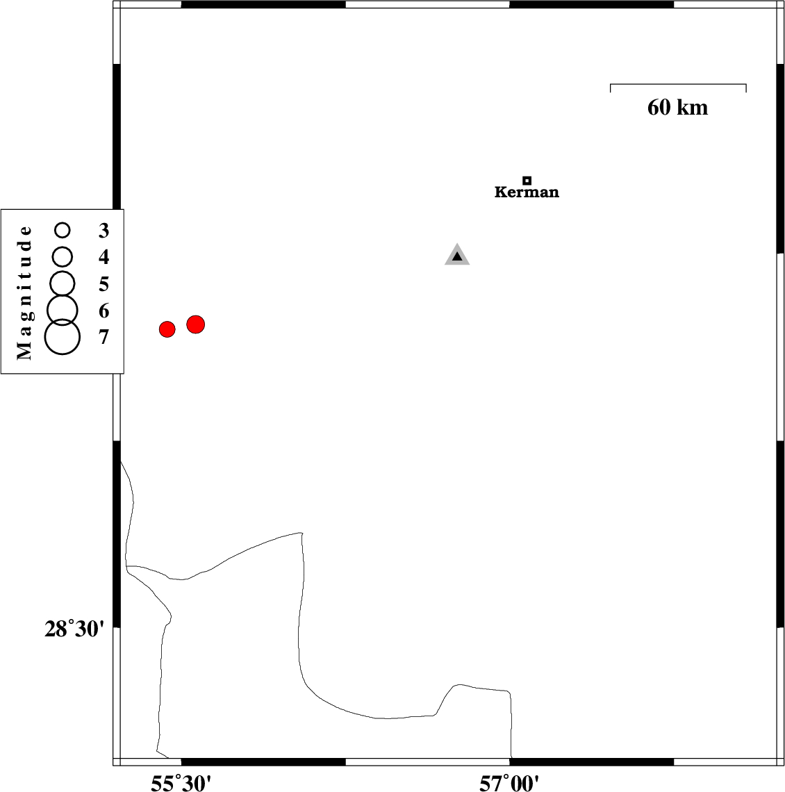 | 2020/07/28 | 06:06:39.9 | 10:36:39.9 | 30.78 | 57.41 | 10 | ML4.6 | Kerman Province, 63 km North-East of Kerman | ||