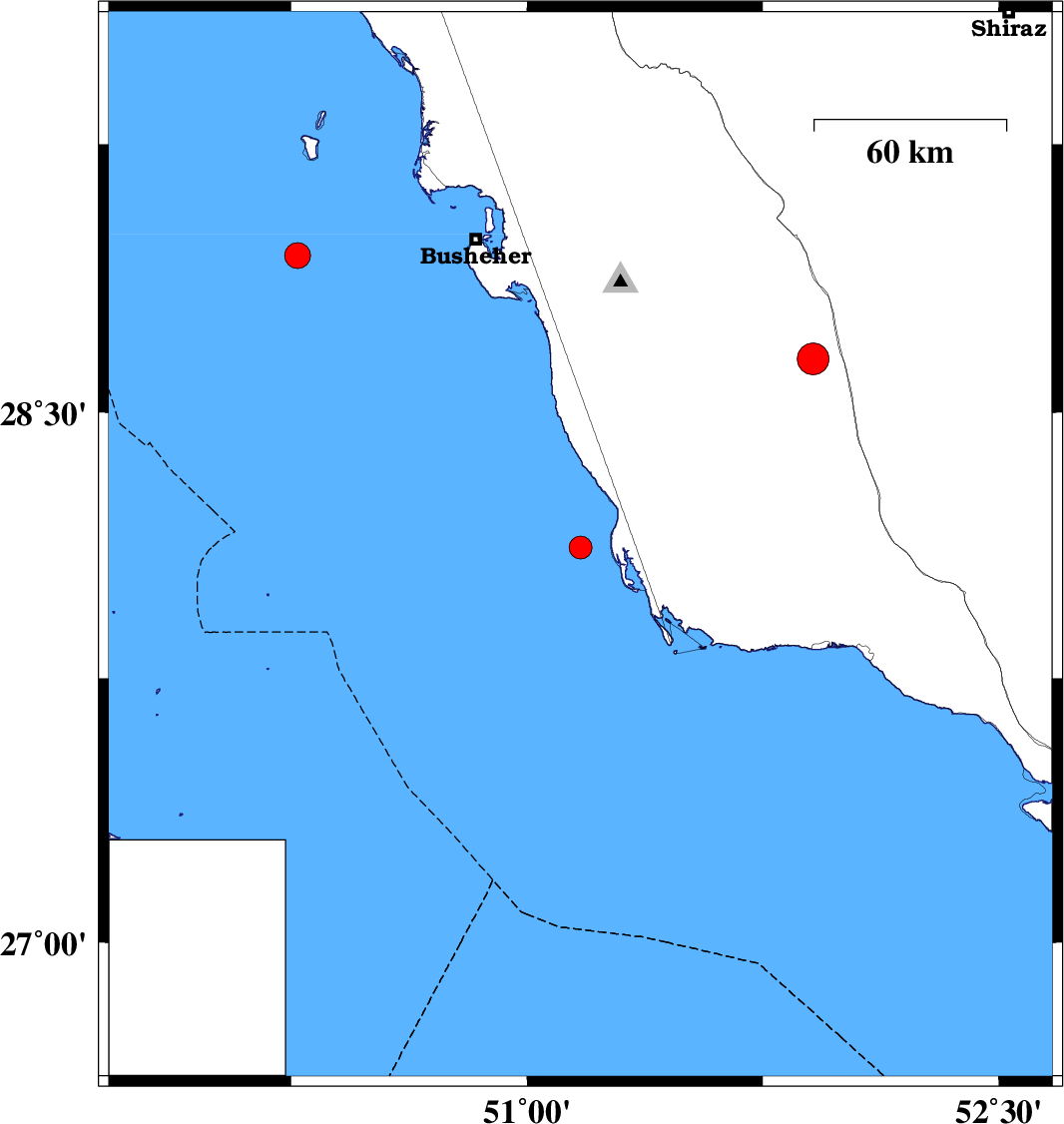| 2020/08/10 | 06:40:32.1 | 11:10:32.1 | 28.94 | 50.27 | 22 | ML3.7 | Persian Gulf, 55 km -West of Busheher |