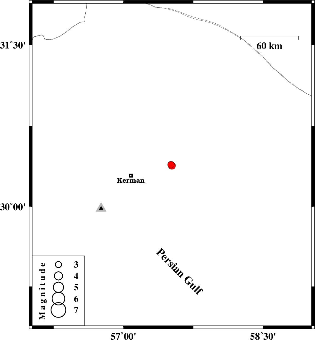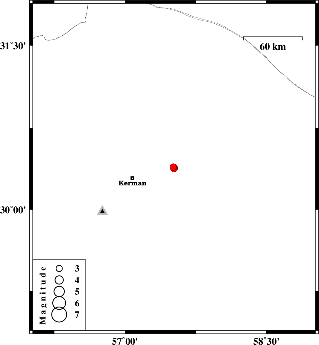 | 2020/08/22 | 14:38:09.3 | 19:08:09.3 | 30.39 | 57.51 | 10 | ML3.3 | Kerman Province, 43 km North-East of Kerman | ||
