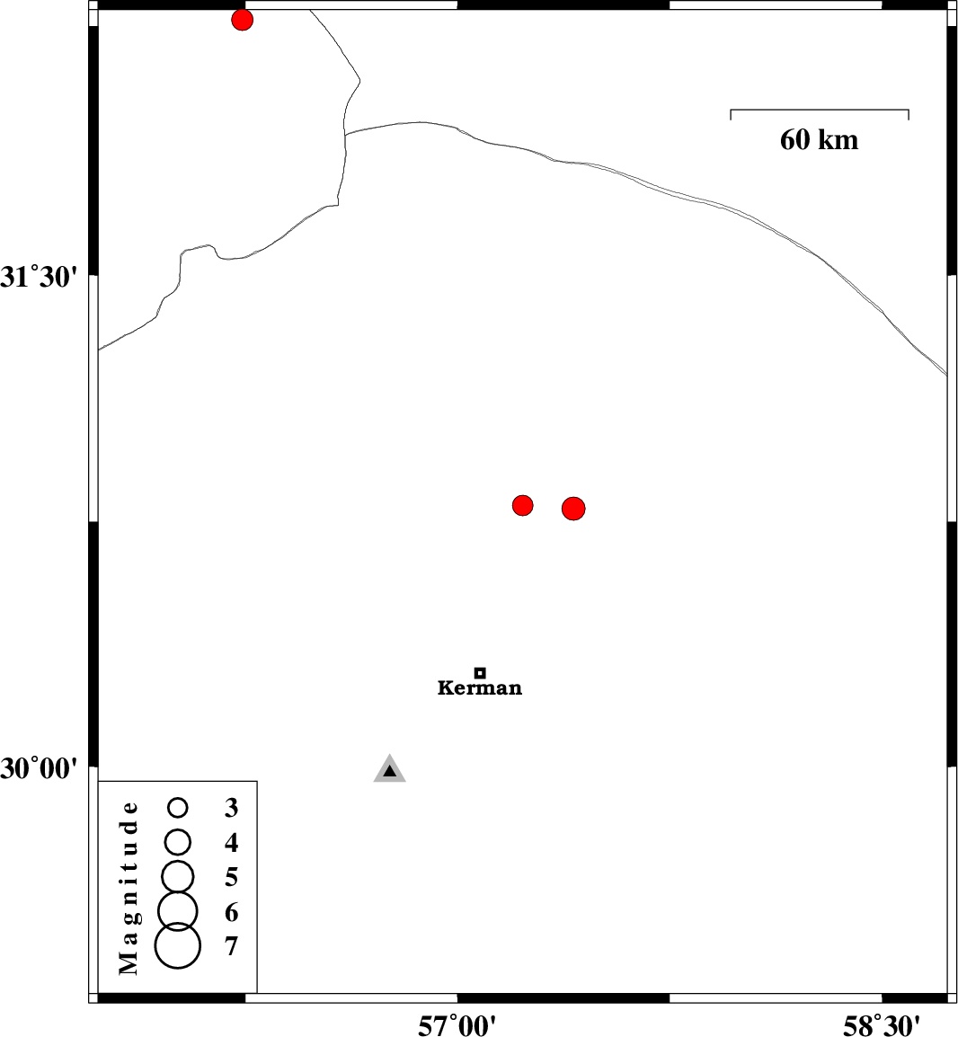| 2020/09/19 | 09:23:13.5 | 13:53:13.5 | 30.8 | 57.23 | 10 | ML3.2 | Kerman Province, 59 km North-East of Kerman |