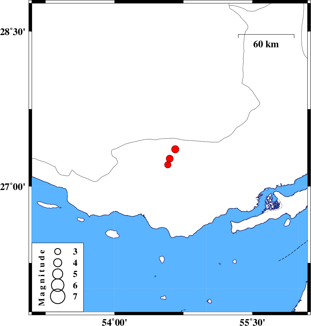 | 2020/10/26 | 17:28:14.1 | 20:58:14.1 | 27.36 | 54.66 | 10 | ML3.6 | Hormozgan Province, 34 km North-East of Bastak |
